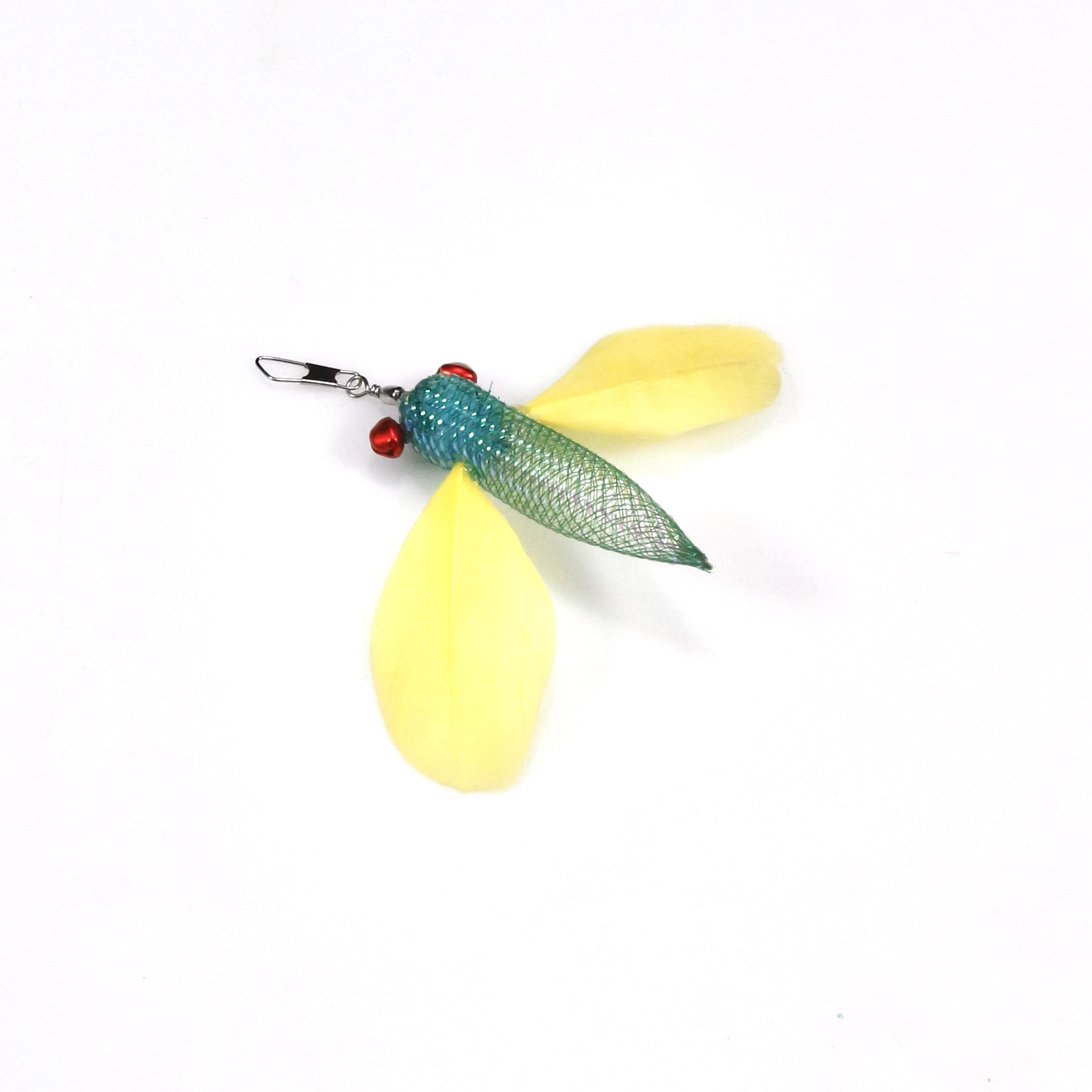 This flying fish cat wand replacement head features a realistic insect-inspired design with soft feather wings, a shiny mesh body, and small bell accents. Its lively and playful appearance can quickly catch your cat’s attention. During play, the feathers and bells create dynamic movement and sound stimulation, helping trigger your cat’s natural instincts to chase, pounce, swat, and jump.