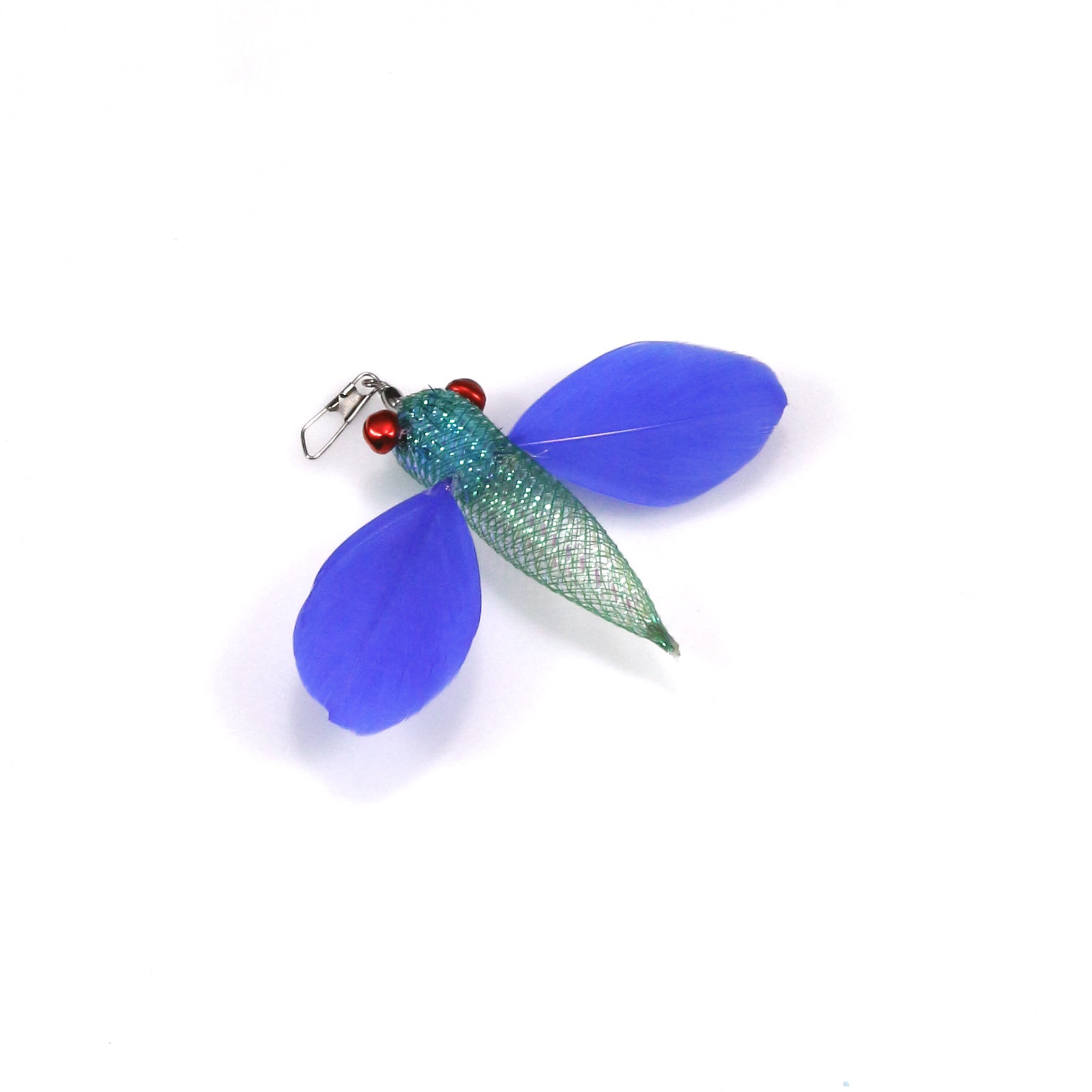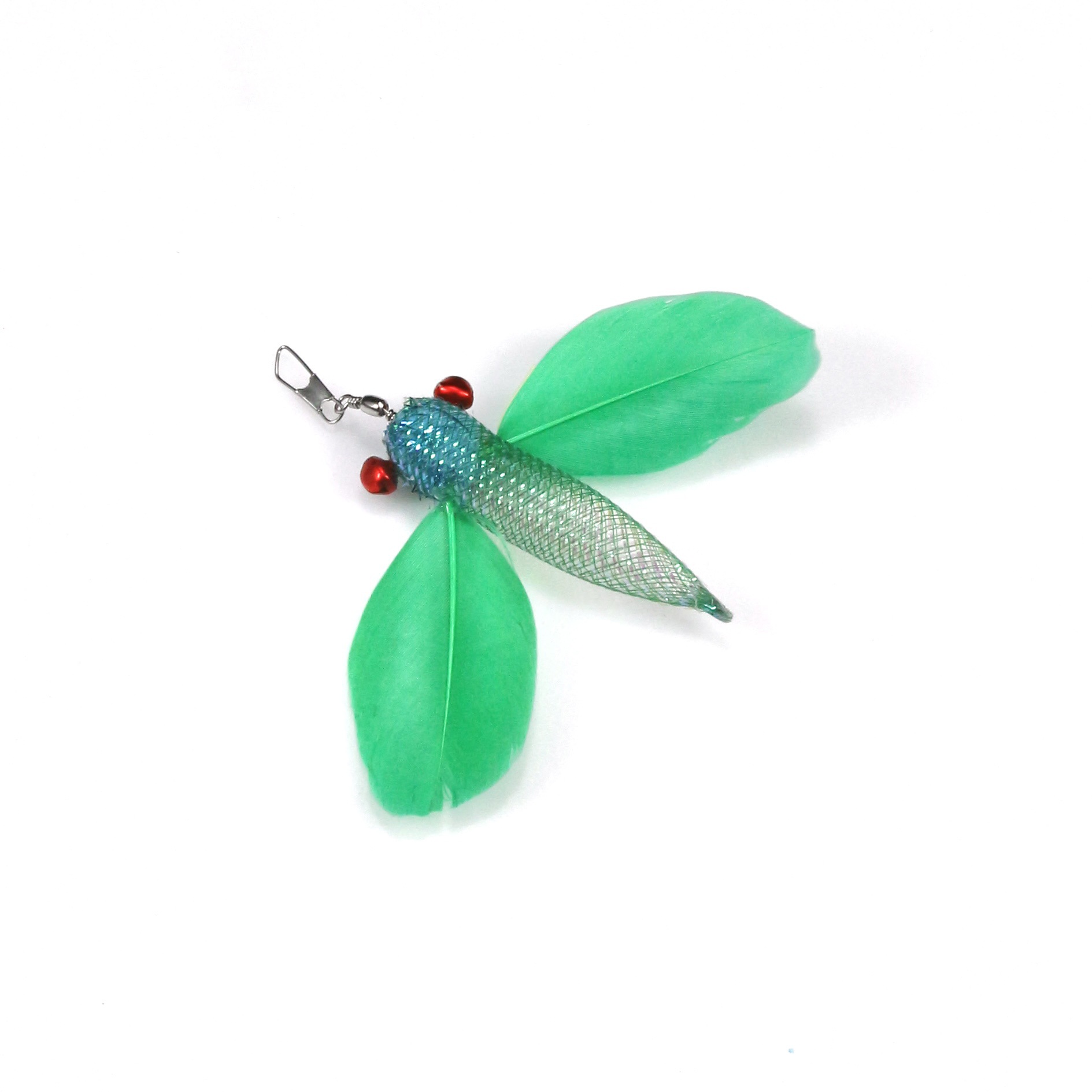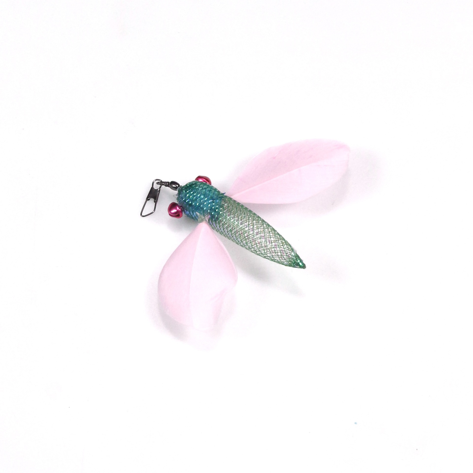 This flying fish cat wand replacement head features a realistic insect-inspired design with soft feather wings, a shiny mesh body, and small bell accents. Its lively and playful appearance can quickly catch your cat’s attention. During play, the feathers and bells create dynamic movement and sound stimulation, helping trigger your cat’s natural instincts to chase, pounce, swat, and jump.